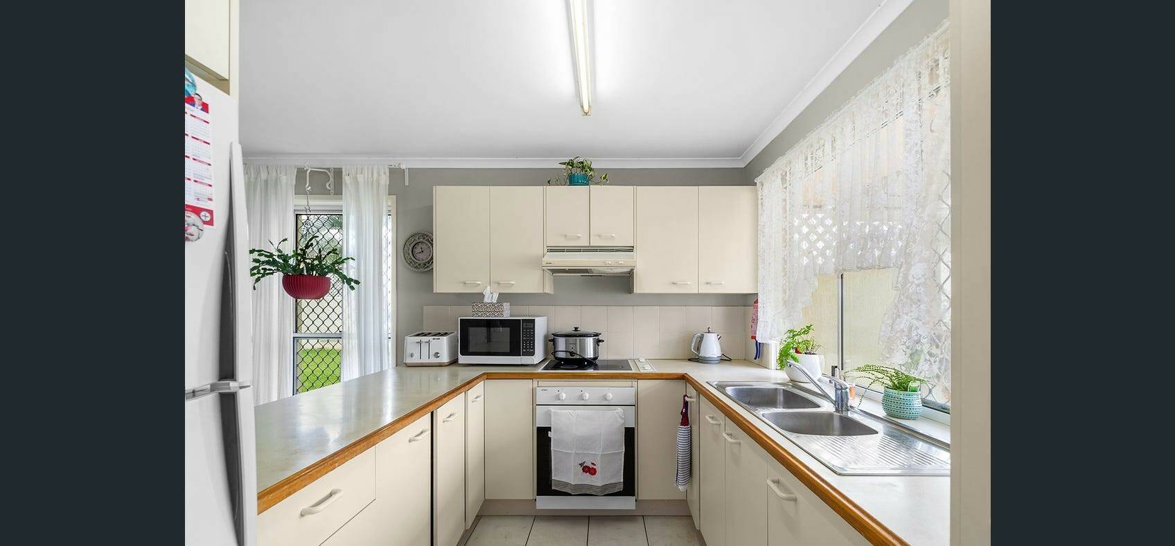 • Kitchen features electric cooking appliances and has ample bench space and storage