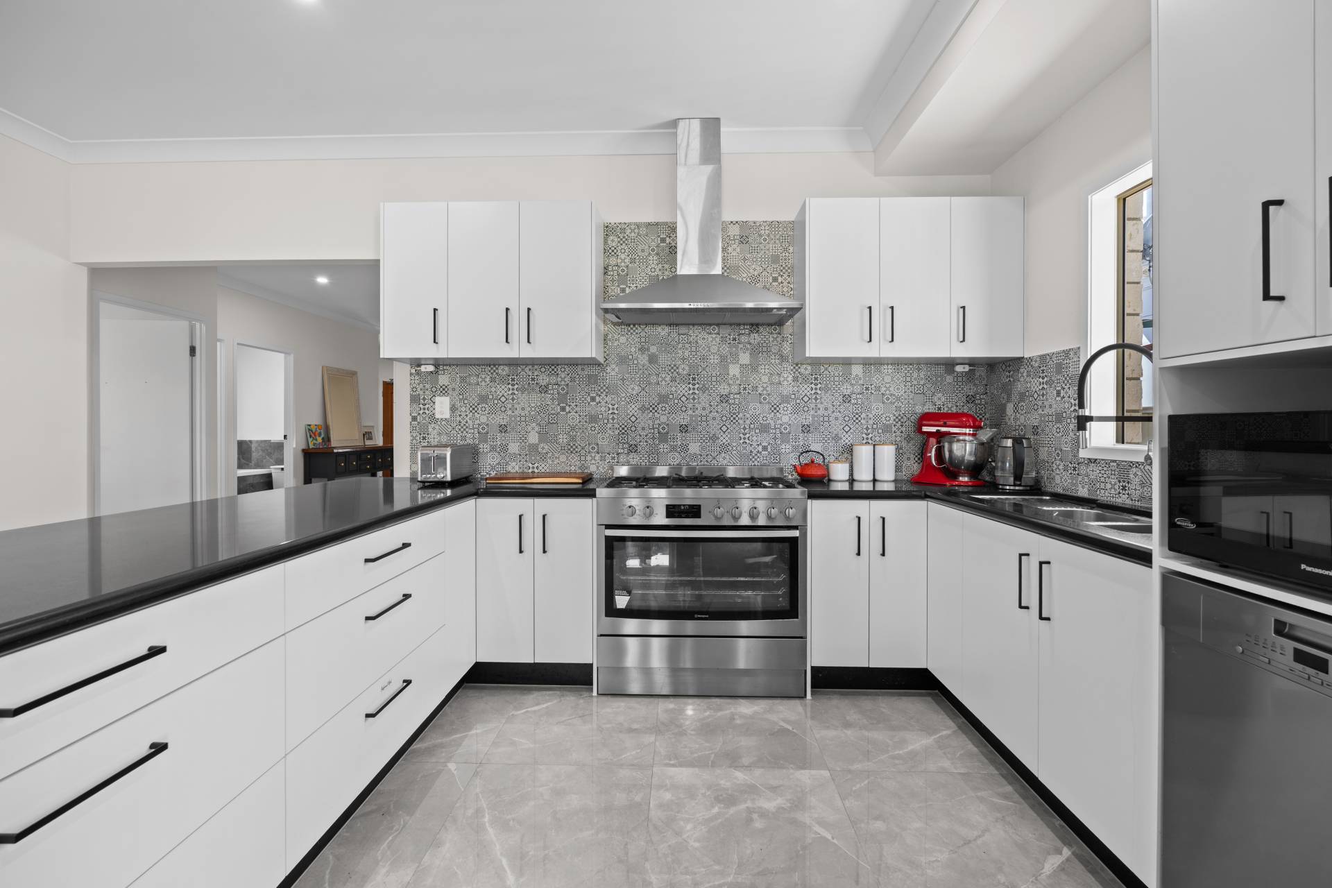 • Modern, fully renovated kitchen featuring 40mm Caesarstone benchtops, a premium Miele dishwasher, and a 900mm gas oven